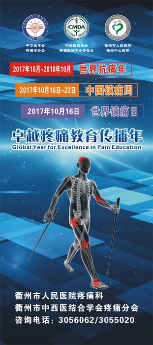 ?? 值此“中國鎮(zhèn)痛周”來臨之際,衢州市人民醫(yī)院疼痛醫(yī)學(xué)專家將于2017年10月16日上午在西區(qū)美年大健康(白云中大道39號(hào),吾悅廣場對(duì)面)開展義診活動(dòng)。屆時(shí)將針對(duì)大家最為關(guān)注的常見慢性疼痛性疾病如頭痛、頸椎病、肩周炎、腱鞘炎、帶狀皰疹后神經(jīng)痛、骨質(zhì)疏松性疼痛、晚期癌痛、頸腰椎間盤突出癥、坐骨神經(jīng)痛、膝關(guān)節(jié)炎、髖關(guān)節(jié)病等疾病進(jìn)行現(xiàn)場免費(fèi)咨詢,同時(shí)有機(jī)會(huì)獲得免費(fèi)沖擊波及紅外偏正光治療。