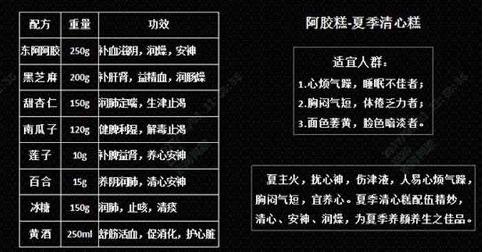 ??? 阿膠滋陰潤燥、補(bǔ)血益氣,配以黑芝麻、南瓜子、甜杏仁、蓮子和百合等,清心健脾,潤肺益腎。夏季清心糕配伍精妙,清心、安神、潤燥,為夏季養(yǎng)顏養(yǎng)生佳品。