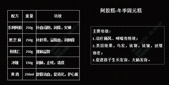 ??? 阿膠固元糕也叫“阿膠核桃糕”,配以核桃仁、黑芝麻、冰糖,用黃酒熬制而成。具有補(bǔ)血滋陰,潤燥,止血之功效;用于血虛萎黃,眩暈心悸,心煩不眠,肺燥咳嗽等癥。