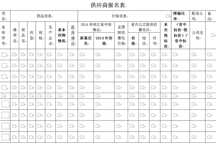(五)報名表(供應(yīng)商按要求申報藥品品名、劑型、規(guī)格、產(chǎn)地、基藥、醫(yī)保、價格情況等) (附件6);