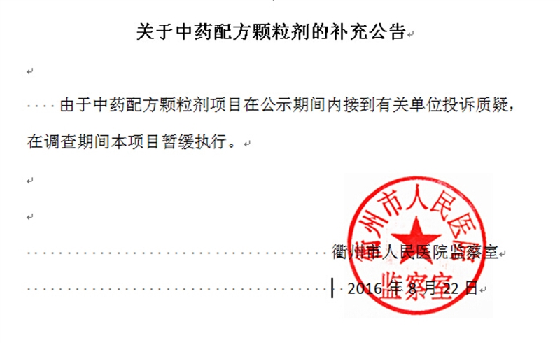 關(guān)于中藥配方顆粒劑的補(bǔ)充公告 文章來源:監(jiān)察室 作者: 點(diǎn)擊數(shù):6005 更新時(shí)間:2016-08-22 上一篇: 2012年春季編外用工招聘有關(guān)事項(xiàng)公告 下一篇: 關(guān)于衢州市人民醫(yī)院中藥飲片采購(gòu)項(xiàng)目成交公示