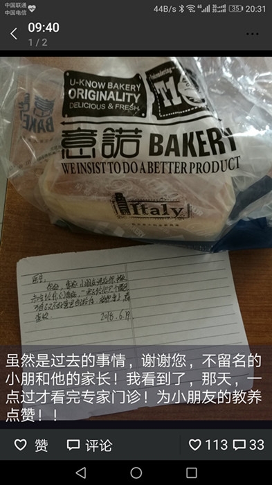 ??? 由于當天就診的病人中有不少小病號,毛思紅也不敢確定是哪位懂事的孩子。幾天后,他在朋友圈回憶這件事,獲得了百余人的點贊。