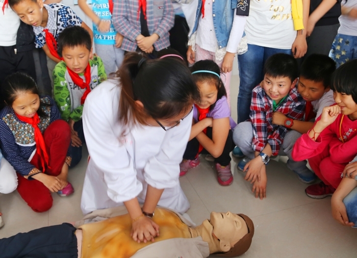 ?? “護(hù)士姐姐,我這樣按壓對不對”、“護(hù)士姐姐,我這力氣夠大了嗎”……5月22日,市區(qū)新華小學(xué)五樓的技能實(shí)驗(yàn)室里好不熱鬧,衢州市人民醫(yī)院急診科的三名醫(yī)護(hù)人員,利用休息時(shí)間為四十余名五年級的學(xué)生講解急救知識,并示范心肺復(fù)蘇的正確方法。