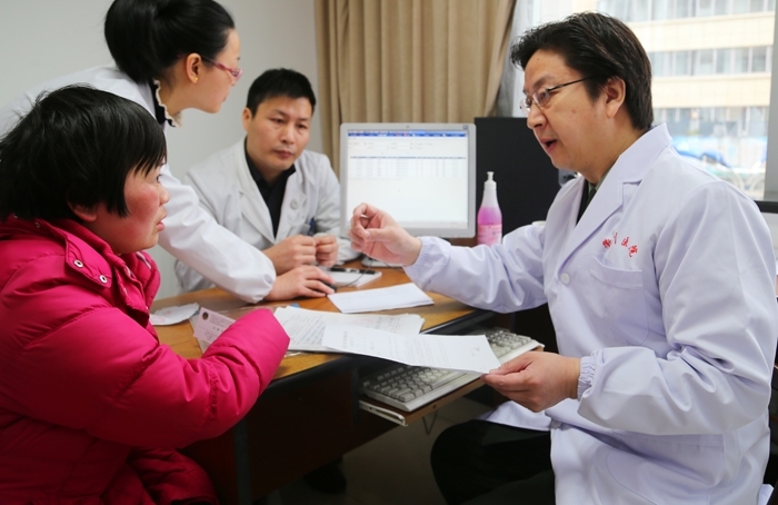 乳腺腫瘤專家江澤飛教授(右)在義診現(xiàn)場(chǎng)。