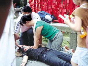“雖然脈搏沒恢復(fù),可我們已經(jīng)感覺到病人已有微弱的呼吸了,說明是有希望的。后來又有懂得心肺復(fù)蘇救護技術(shù)的一男一女兩名醫(yī)務(wù)人員加入搶救隊伍,我們4人輪流施救?!绷中【暾f,來自天南地北的游客也不斷地送水、換毛巾、扇風、鋪墊子,配合搶救工作。