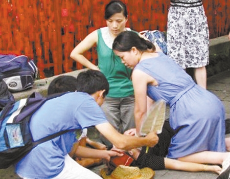 回憶起,事情發(fā)生在7月30日,林小娟和朋友一起帶孩子到廬山游玩,她從山上往下走的時候,看到平臺上一個人跪著給一個躺在地上的人做胸外心臟按壓?!拔业谝环磻牵y道他們在做演習?”走近一看,躺在地上的人臉上呈現(xiàn)出的是一種瀕死狀態(tài),在急救室工作過3年多,林小娟意識到,患者情況危急,。沒有一秒鐘的猶豫,她一邊對正做按壓的人說“我也是護士,我來幫忙!”一邊迅速跪在患者左側(cè),接著做起胸外心臟按壓。事后才知道,一起做按壓的人是王央萍。
