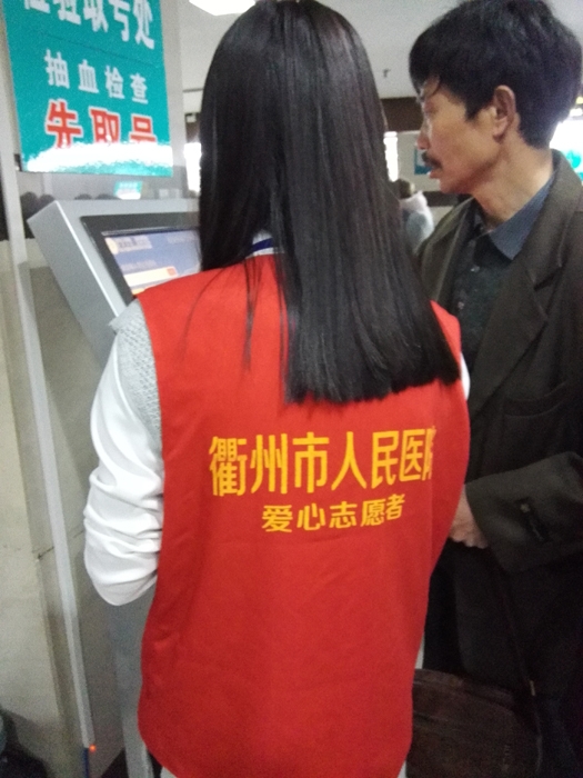 ??? 周素珍、潘正照 、譚惠娟、張月萍、徐素珍、封蘇平、賴訊、余倫琪、蔣俊梅、毛晨暄、鄭小娟等11人在衢州市人民醫(yī)院做志愿者,主要來自社會志愿者和本院志愿者。 志愿者們主要為患者指路引導(dǎo),陪伴行動不便、年老體弱患者就診,指導(dǎo)患者自助服務(wù)機(jī)使用方法,引導(dǎo)患者化驗(yàn)前取號、打印化驗(yàn)單,協(xié)助門診大廳工作人員疏導(dǎo)病人。