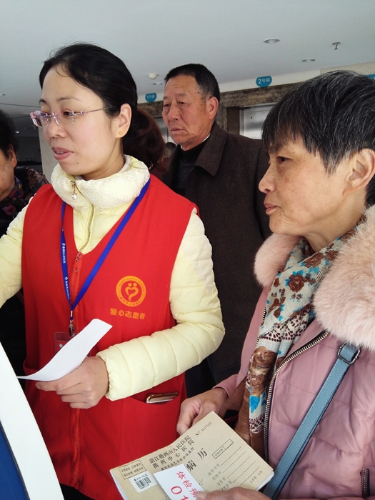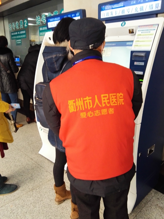 ??? 葉時(shí)輯、汪益珠、楊美姣、朱愛英、劉雪珍、方月升、胡曉芬、徐國良、汪錫耀、林涵穎、張峰、夢萍、劉瑩、錢帥、徐雪梅等15人在衢州市人民醫(yī)院做志愿者,主要來自社會志愿者和本院志愿者。 志愿者們主要為患者指路引導(dǎo),陪伴行動(dòng)不便、年老體弱患者就診,指導(dǎo)患者自助服務(wù)機(jī)使用方法,引導(dǎo)患者化驗(yàn)前取號、打印化驗(yàn)單,協(xié)助門診大廳工作人員疏導(dǎo)病人。