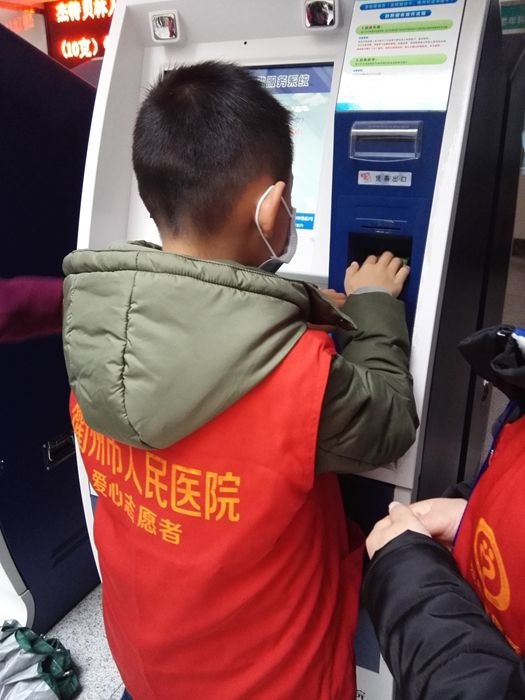 ??? 李興江、余照坤、徐家梅、陳安琪、翁文淵、洪波、徐倞舟等7人在衢州市人民醫(yī)院做志愿者,主要來(lái)自寒假學(xué)生志愿者。 志愿者們主要為患者指路引導(dǎo),陪伴行動(dòng)不便、年老體弱患者就診,指導(dǎo)患者自助服務(wù)機(jī)使用方法,引導(dǎo)患者化驗(yàn)前取號(hào)、打印化驗(yàn)單,協(xié)助門診大廳工作人員疏導(dǎo)病人。