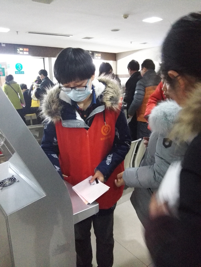 ??? 徐鑫洋、湯美娟、湯玉卿、陳夏雯、徐嘉妮、葉佳怡、周育存、汪潔瓊、李興江、余照坤、翁文淵、徐家梅、陳安琪等13人在衢州市人民醫(yī)院做志愿者,主要來自寒假學(xué)生志愿者。 志愿者們主要為患者指路引導(dǎo),陪伴行動不便、年老體弱患者就診,指導(dǎo)患者自助服務(wù)機(jī)使用方法,引導(dǎo)患者化驗前取號、打印化驗單,協(xié)助門診大廳工作人員疏導(dǎo)病人。