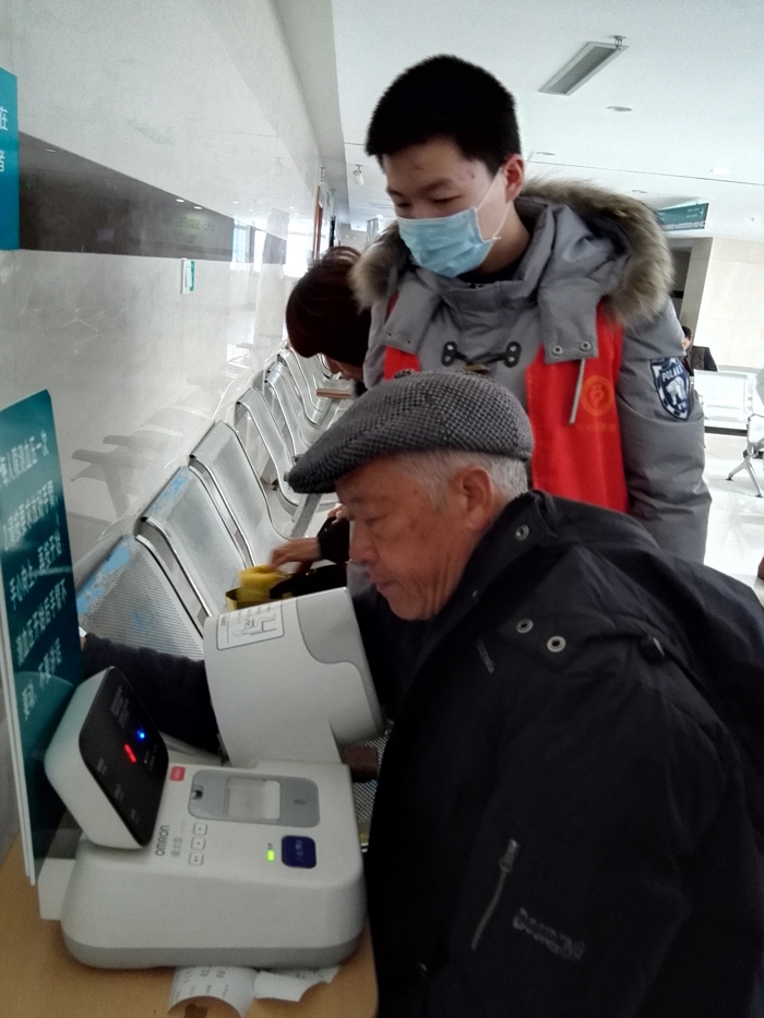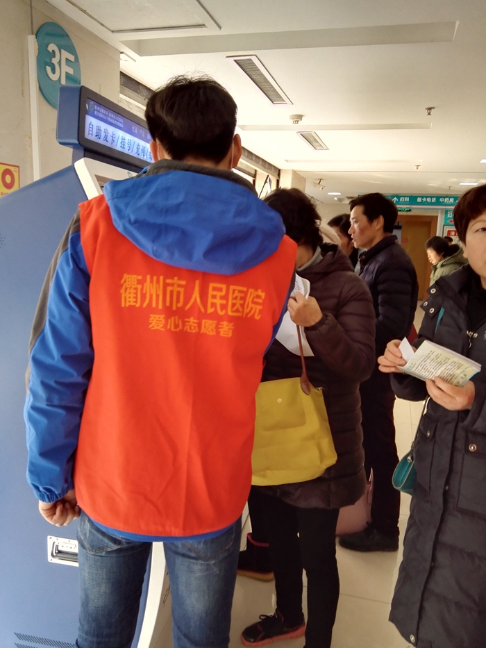 ??? 徐鑫洋、湯美娟、湯玉卿、陳夏雯、徐嘉妮、葉佳怡、周育存、汪潔瓊、李興江、余照坤、藍一添、張陳韜、柴家林等13人在衢州市人民醫(yī)院做志愿者,主要來自寒假學(xué)生志愿者。 志愿者們主要為患者指路引導(dǎo),陪伴行動不便、年老體弱患者就診,指導(dǎo)患者自助服務(wù)機使用方法,引導(dǎo)患者化驗前取號、打印化驗單,協(xié)助門診大廳工作人員疏導(dǎo)病人。