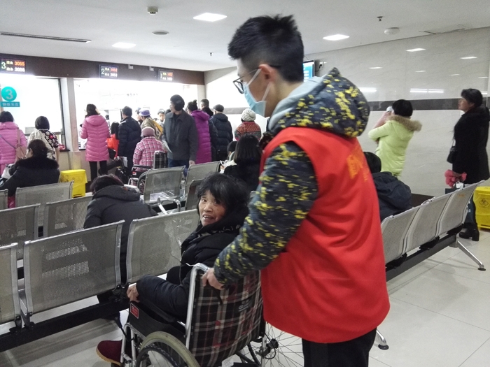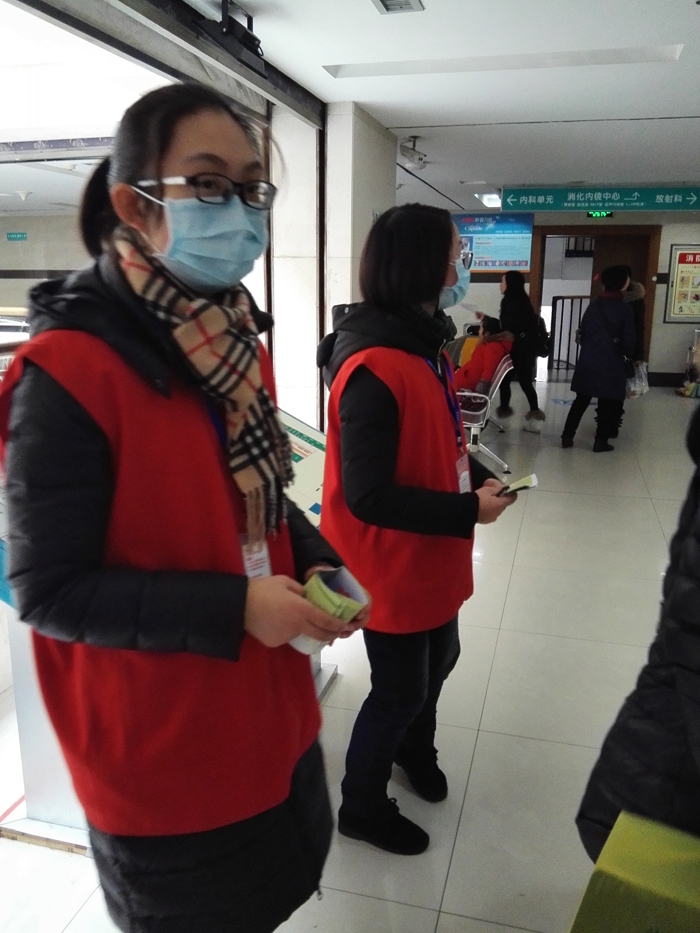 ??? 余慧晨、徐思惠、張莘陟、徐安琪、呂丹、陳玉瑩、徐怡、周孟穎、周慧娟、毛如意、鄭琦慧、葉佳蕓、王喬梅等13人在衢州市人民醫(yī)院做志愿者,主要來(lái)自寒假學(xué)生志愿者。 志愿者們主要為患者指路引導(dǎo),陪伴行動(dòng)不便、年老體弱患者就診,指導(dǎo)患者自助服務(wù)機(jī)使用方法,引導(dǎo)患者化驗(yàn)前取號(hào)、打印化驗(yàn)單,協(xié)助門診大廳工作人員疏導(dǎo)病人。