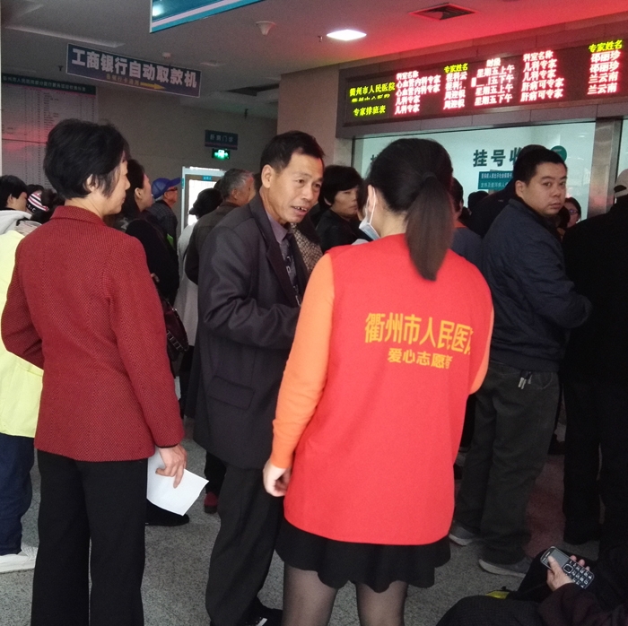 ??? 丁潔元、豐學(xué)謙、胡曉芬、鄭紅燕、童玲玲、陳彩英、黃玲、王琍穎等11人在衢州市人民醫(yī)院做志愿者,他們累計(jì)時(shí)間500余小時(shí)。志愿者們主要在門診大廳一樓至五樓接受患者咨詢、引導(dǎo)自助機(jī)服務(wù)方法、流動(dòng)服務(wù),幫助身體虛弱及身心障礙者等提供引導(dǎo)、協(xié)助門診大廳工作人員疏導(dǎo)病人。