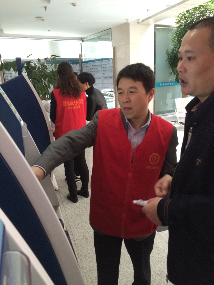 ??? 劉文勇、于巧琴、廖利軍、王華清、徐文凱、張麗萍、邵微穎、許志娟、應(yīng)曉麗、鄭妙玲、張彩軍、徐菊慧、黃霜等13人在衢州市人民醫(yī)院做志愿者。志愿者們主要在門(mén)診大廳一樓至五樓接受患者咨詢、引導(dǎo)自助服務(wù)機(jī)使用方法、流動(dòng)服務(wù),幫助身體虛弱及身心障礙者等提供引導(dǎo)、協(xié)助門(mén)診大廳工作人員疏導(dǎo)病人。