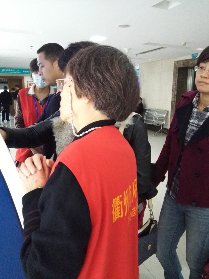 ??? 2015年11月2日,丁潔元、毛曉霞、吳婷婷、萬凌云、鄭黛妃、朱愛英、豐學(xué)謙、翁文淵、洪波、陳彩英、吳紫薇、駱文艷、炒宇帆等13人在衢州市人民醫(yī)院做志愿者,他們累計(jì)服務(wù)500余小時(shí),豐學(xué)謙同志年齡高達(dá)79歲堅(jiān)持每周一次來做志愿者。志愿者們主要在門診大廳一樓至五樓接受患者咨詢、引導(dǎo)自助服務(wù)機(jī)使用方法、流動(dòng)服務(wù),幫助身體虛弱及身心障礙者等提供引導(dǎo)、協(xié)助門診大廳工作人員疏導(dǎo)病人。