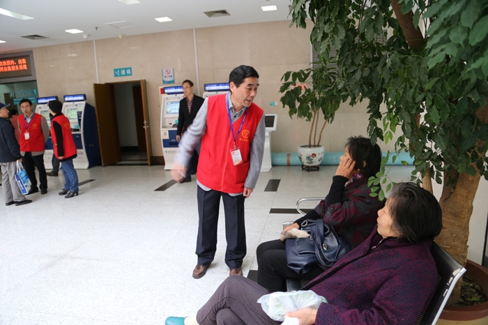 ??? 陳根成、胡正良、徐春風(fēng)、胡曉燕、徐天才、張劍英、徐天生、周珊、江聰聰、程婷、洪倩、徐安等12人在衢州市人民醫(yī)院做志愿者。志愿者們主要在門診大廳一樓至五樓接受患者咨詢、引導(dǎo)自助服務(wù)機(jī)使用方法、流動(dòng)服務(wù),幫助身體虛弱及身心障礙者等提供引導(dǎo)、協(xié)助門診大廳工作人員疏導(dǎo)病人。