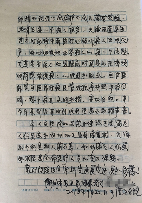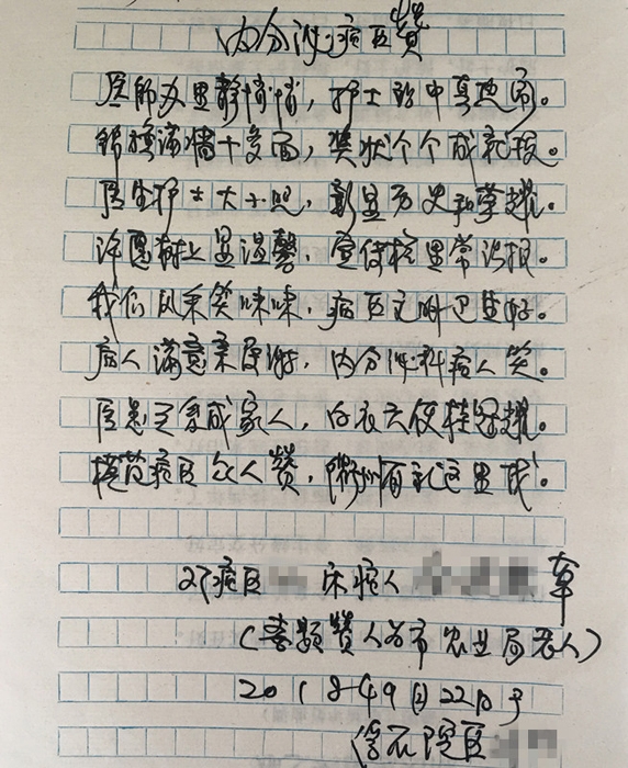 ??? “這個(gè)老人真的很有心。出院第二天上午我有事不在辦公室里,誰(shuí)知道老人等到11點(diǎn)30分,親自把寫(xiě)好的兩首點(diǎn)贊詩(shī)歌和一首點(diǎn)贊詩(shī)送到我手中?!标愑鹤o(hù)士長(zhǎng)說(shuō),“老先生還將兩首詩(shī)歌復(fù)印了5份,并囑托我,一定要將復(fù)印件交給醫(yī)院?!?/p>