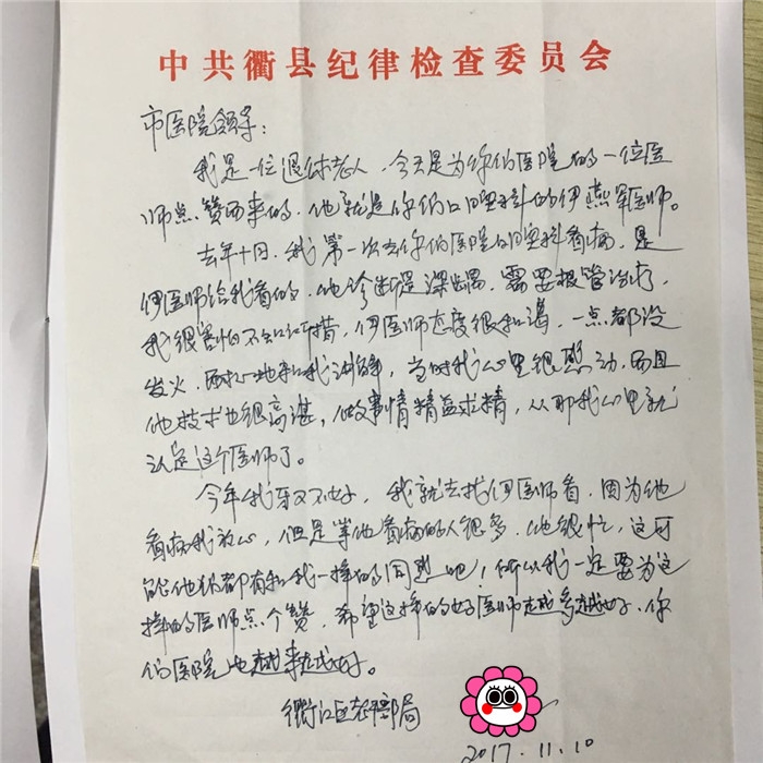 伊燕軍----衢江區(qū)老干部局退休老人為口腔科醫(yī)師送來(lái)感謝信 文章來(lái)源:宣聯(lián)處 作者: 點(diǎn)擊數(shù):9156 更新時(shí)間:2017-11-17 ??? 11月15日,衢江區(qū)老干部局的曾阿姨來(lái)到我院,把她寫的一封感謝信親手交到醫(yī)院黨辦,以感謝為她看病的口腔科醫(yī)生伊燕軍。 ? ? 上一篇: 吳善水——第六屆“浙江省優(yōu)秀醫(yī)師獎(jiǎng)”獲得者 下一篇: 【衢醫(yī)有禮】近20年風(fēng)雨相伴,這位醫(yī)生和病患的關(guān)系超越了親人