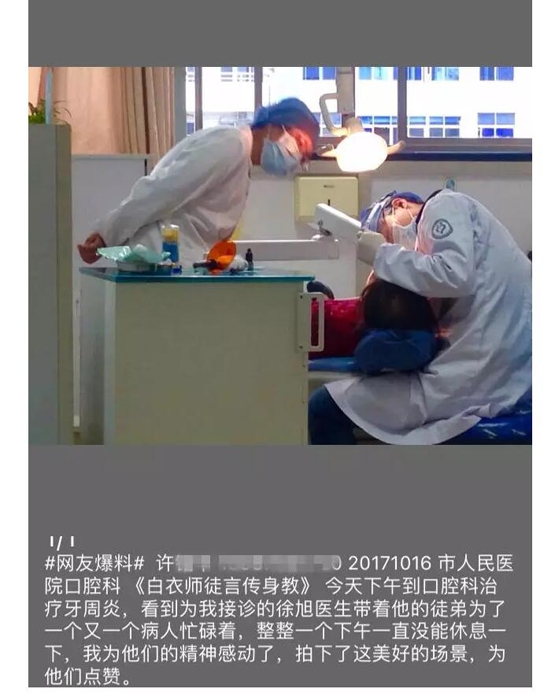 ??? 他在“無線衢州”上爆料稱:“今天下午到口腔科治療牙周炎,看到為我接診的徐旭醫(yī)生帶著他的徒弟為了一個又一個病人忙碌著,整整一個下午一直沒能休息一下,我為他們的精神感動了,拍下了這美好的場景,為他們點贊。”