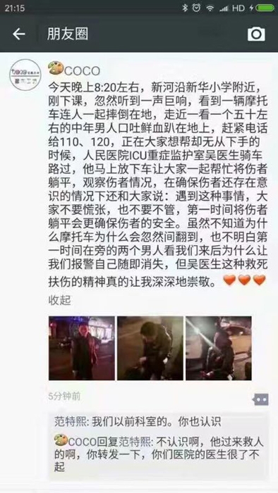 ??? 10分鐘不到,救護(hù)車(chē)抵達(dá),見(jiàn)男子被同事接手,自己也就放心回家了。沒(méi)想到,吳華勇救人的過(guò)程被路人拍照上傳到朋友圈,一時(shí)間,這件事傳開(kāi)了。回到家沒(méi)多久,吳華勇也看到了這條微信,可是他更關(guān)心傷者的情況。第二天一大早,吳華勇得知受傷男子腦出血,顴骨骨折,需要留院繼續(xù)觀察,暫無(wú)生命危險(xiǎn)。而據(jù)急診內(nèi)科醫(yī)生介紹,當(dāng)晚男子喝了酒,如果他仍保持倒地時(shí)的姿勢(shì),嘔吐物很可能導(dǎo)致窒息死亡。