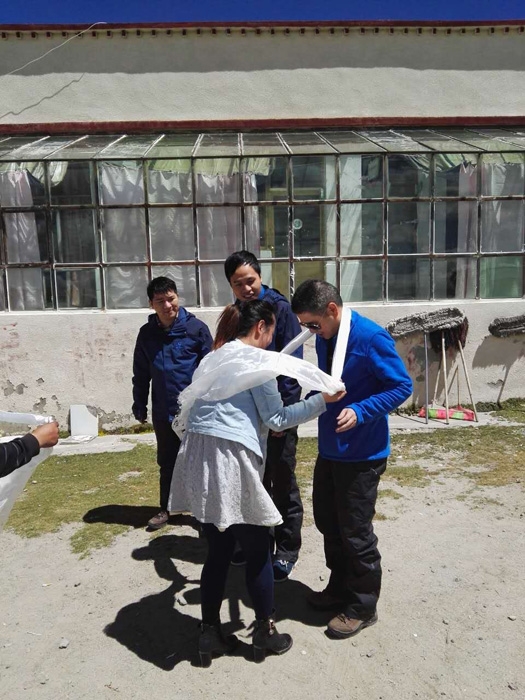 ??? 一下飛機,我只覺得走路就像踩在了棉花里,輕飄飄的。前來迎接的藏族同胞就獻上了潔白的哈達,以當(dāng)?shù)刈顭崆槁≈氐亩Y儀迎接我們。還沒有從藏族同胞敬獻哈達的歡愉中平靜下來,入住的當(dāng)晚便有部分隊員出現(xiàn)了輕度不適的高原反應(yīng)。因為第二天馬上要參加為期三天的工作培訓(xùn),很多同志不得不加入吸氧的行列,有位隊員當(dāng)天嘔吐八次,第二天全隊隊員均出現(xiàn)了不同程度的高原反應(yīng)。為了不影響工作,為浙江團隊爭光,大家頂著越來越嚴重的高原反應(yīng),堅持完成了三天緊張連續(xù)的培訓(xùn)任務(wù)。