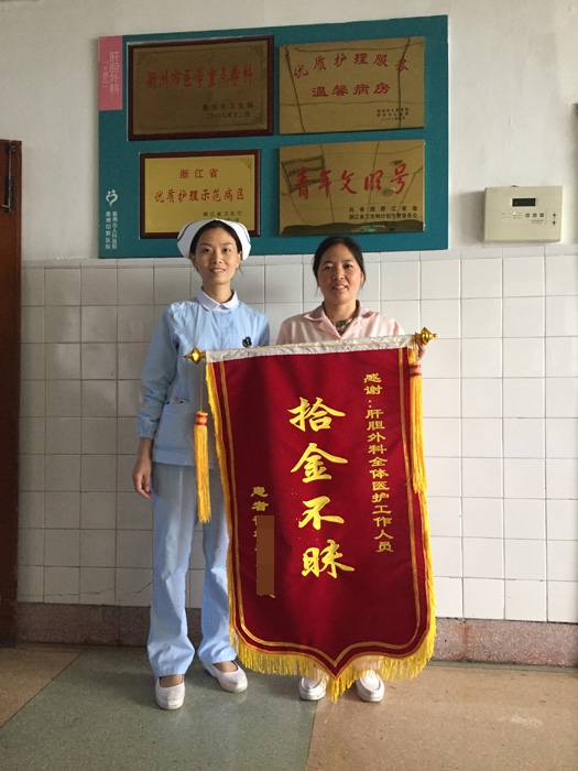 ??? 這一幕發(fā)生在衢州市人民醫(yī)院肝膽外科病區(qū)內(nèi)。錦旗上閃閃發(fā)光的“拾金不昧”四個大字,映襯著王阿姨那飽經(jīng)風(fēng)霜又泛著紅暈的臉。