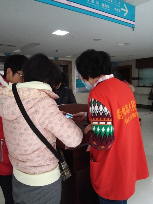 ??? 洪波、王建中、王金妹、王宇寧、胡曉芬、楊君梅、張俊晴、任紅、孫平平、章建霞、周華、周妮、金菊仙、杜長寶、傅亞靈、陸佳佳、葉麗婷等17人在衢州市人民醫(yī)院做志愿者,主要來自社會(huì)志愿者和本院志愿者。 志愿者們主要為患者指路引導(dǎo),陪伴行動(dòng)不便、年老體弱患者就診,指導(dǎo)患者自助服務(wù)機(jī)使用方法,引導(dǎo)患者化驗(yàn)前取號、打印化驗(yàn)單,協(xié)助門診大廳工作人員疏導(dǎo)病人。