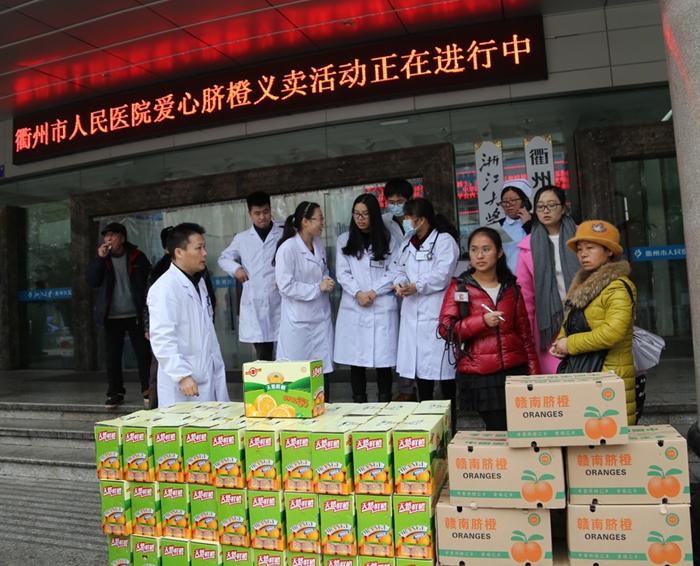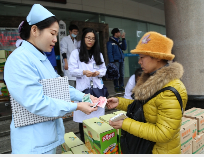 ??? 12月21日下午,在我院門診大廳門口擺放著一箱箱臍橙,原來是腫瘤內(nèi)科主任鄭勤紅及護士長張小芳組織科室醫(yī)務人員在為癌癥患者謝冬蓮舉行愛心義賣,籌集愛心款。
