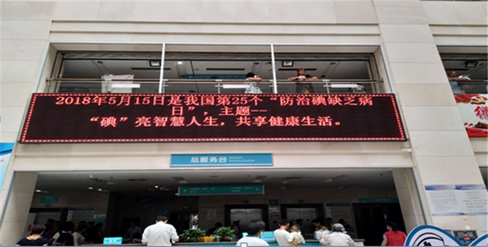 ??? 2018年5月15號是我國第25個“防治碘缺乏病日”,今年的主題是“碘亮智慧人生,共享健康生活”。我院防保處積極響應(yīng)并開展碘缺乏病防治日主題宣傳活動,在宣傳欄擺放 “預(yù)防碘缺乏病”宣傳折頁,在門診大廳的LED屏上滾動播放、宣傳碘缺乏病防治主題。