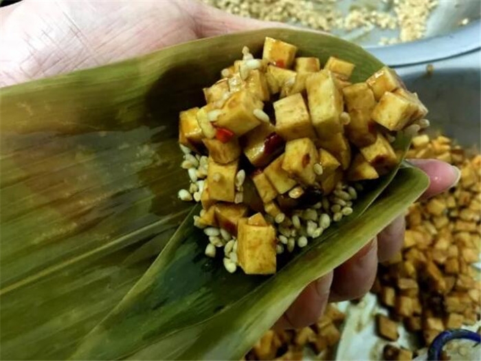 4、粽葉里面放入一層豆米混合物,再放入瘦肉,最后再放一層豆米混合物,將粽子包好,放入鍋中煮熟即可。