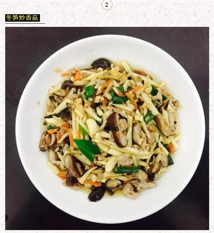 5. 放入少許油再倒入香菇、筍片煸炒,再加入肉絲和紅蘿卜煸炒均勻,加入生抽、鹽、味精調(diào)味,出鍋前撒上青蒜即可。