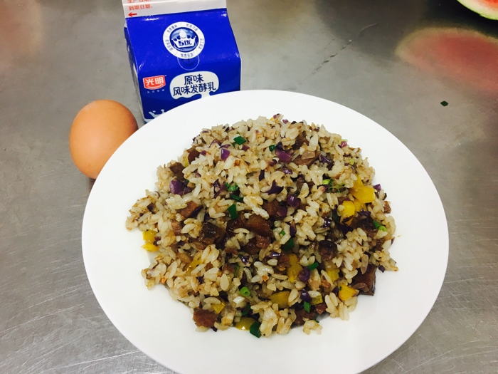 材料:米飯100克、鹵牛肉丁40克、彩椒、洋蔥、紫甘藍