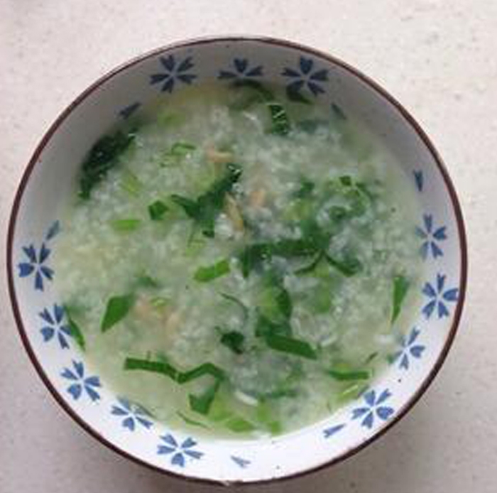 原料:大米80克、海米15克、青菜100克,調(diào)味品:精鹽、少許
