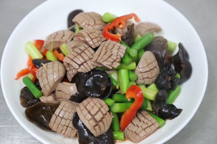 ???????? 炒腰花(材料:豬腰200克、青蒜苗100克、泡發(fā)黑木耳30克、姜、蒜)