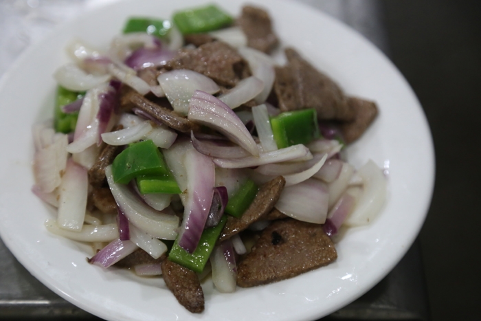 原料:洋蔥200克、豬肝100克、青椒、蔥、姜、蒜等。