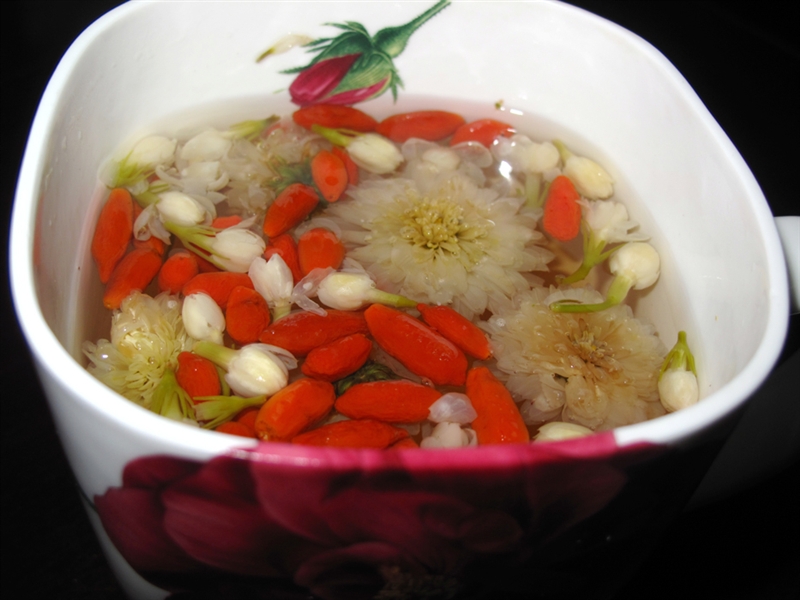制作方法:枸杞7粒,菊花3朵,將菊花和枸杞子用沸水沖泡,待茶湯顏色變深即可飲用。