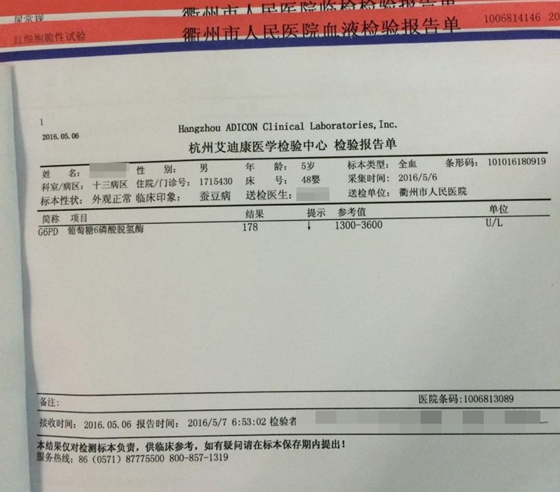 由于這種病有遺傳性,如果父母一方有“蠶豆病”,建議給寶寶,特別是男寶寶檢驗(yàn)一下葡萄糖-6-磷酸脫氫酶(G6PD)或做相關(guān)基因的檢測。