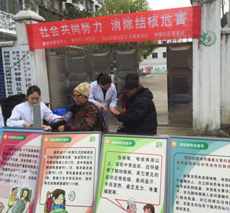 ????當(dāng)日一早,市疾控中心、府山街道社區(qū)衛(wèi)生服務(wù)中心、鐘樓社區(qū)居委會(huì)聯(lián)合我院感染科醫(yī)護(hù)人員在東門菜市場鐘樓底居委會(huì)門口進(jìn)行世界防治結(jié)核病日的宣傳活動(dòng)。