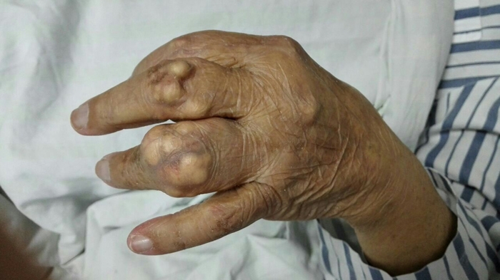 ? 6年前,張大媽就出現(xiàn)了不明原因的多處關(guān)節(jié)疼痛,在當(dāng)?shù)卦\所用地塞米松針治療后有所好轉(zhuǎn),此后反復(fù)發(fā)作,反復(fù)使用激素,但一直未查明病因也沒(méi)有正規(guī)治療。直到10天前,大媽的關(guān)節(jié)疼痛再次發(fā)作,才在家人的陪同下到市人民醫(yī)院尋求幫助。原來(lái),老人的雙手雙腳都已腫得變形,完全無(wú)法彎曲,刀割般的疼痛讓老人連路都走不了,同時(shí)還伴有尿量減少,腰椎疼痛。