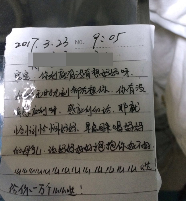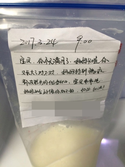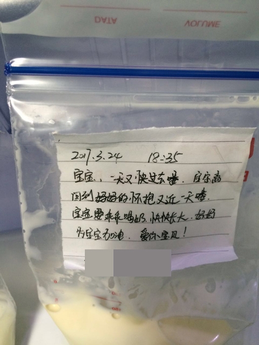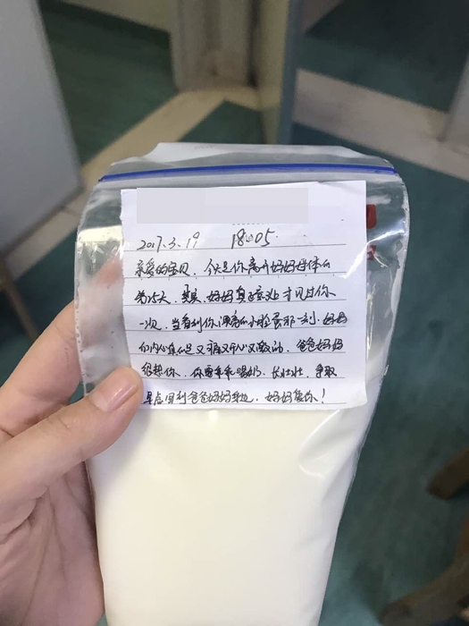 ??? 這一個多月里,小湯圓的媽媽每天都把母乳擠出來存在儲奶袋里,然后由爸爸帶到醫(yī)院交給醫(yī)護人員。她還每天給小湯圓寫信,這些母愛濃濃的字條,催人淚下。