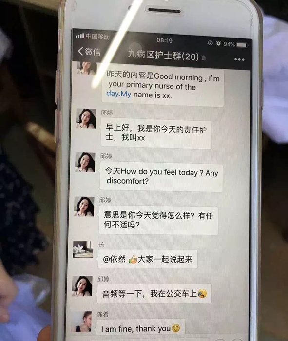 ??? 科室里的其他護(hù)士雖然也懂一些英語(yǔ),但在口語(yǔ)交流上沒(méi)那么順暢。因此,邱婷換班休息的時(shí)候,為了讓其他護(hù)士也能順暢地和小陳交流,她特意在泌尿外科護(hù)士的微信群里發(fā)送簡(jiǎn)單的英語(yǔ)交流句式,如“How do you feel today?”“Any discomfort?”……疼痛評(píng)分、留置針觀察、測(cè)量生命體征、排便情況等一些日常用語(yǔ),被邱婷精心整理并發(fā)送到群里,以便讓同事們“現(xiàn)學(xué)現(xiàn)用”。