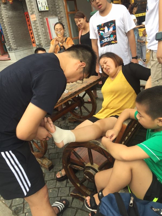 ??? 大媽左腳踝處有明顯紅腫,周圍肌肉僵硬,無法行走。因為事發(fā)突然,林瑜立即采取了應急處理,經(jīng)過冰敷、手法復位后,大媽感覺疼痛得到了明顯的緩解。