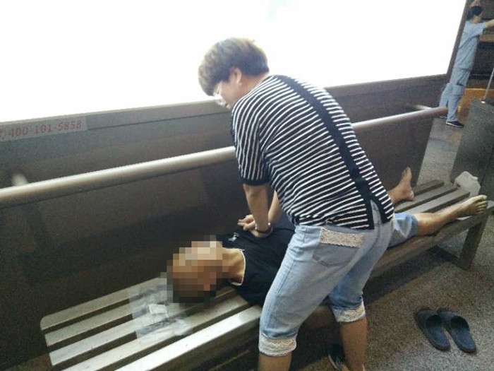 ??? 得知在13車廂有患者遇到突發(fā)情況。邵微穎立馬從候車廳跑到站臺邊,此時,一名成年男子躺在長凳上,旁邊站著車站的工作人員。