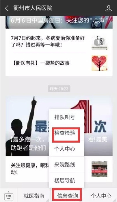 ??? 1.微信公眾號:關注我院微信公眾號,綁定個人信息后,在“信息查詢”中找到“檢查檢驗”,根據(jù)檢查類型選擇查詢報告單。