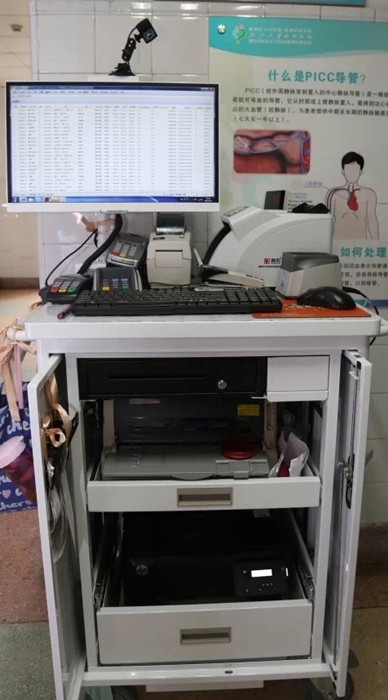 ??? 這臺(tái)移動(dòng)小車(chē),配備有辦公電腦、票據(jù)打印機(jī)、醫(yī)??ㄗx卡器等設(shè)備,相當(dāng)于一個(gè)移動(dòng)的收費(fèi)窗口。工作人員來(lái)到病房進(jìn)行結(jié)算,真是既快捷又方便。支持醫(yī)???、銀行卡、現(xiàn)金、微信、支付寶等結(jié)算方式。