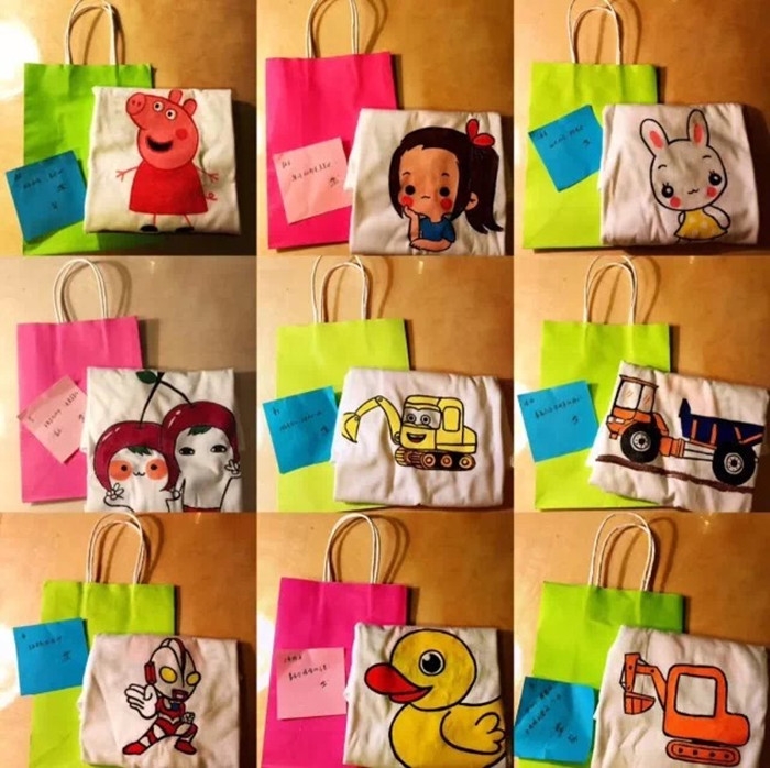 ??? 除了班里的禮物外,胡曉丹還給班里的兩位老師和保育員也畫了可愛的T恤,送給小朋友時,專門準(zhǔn)備了可愛的紙袋,還給每個人都寫了一張小紙條表達(dá)祝福。