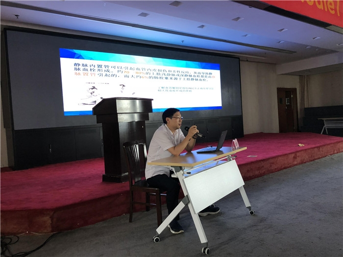 ??? 我院血管外科陸煒主任授課的"血管解剖及導(dǎo)管相關(guān)性的血栓",深入淺出的講解了上肢血管及PICC解剖位置,使學(xué)員對血管解剖有了一定的了解,掌握靜脈血栓的預(yù)防及處理措施。