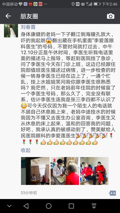 ??? 3月23日中午12點(diǎn)左右,劉春霞的老媽突然感覺眼睛很痛,胃里翻江倒海般難受,被大女兒緊急送到了我院。小女兒劉春霞也著急地往醫(yī)院趕,聽說老媽瞳孔都放大了,她嚇得趕緊拿出手機(jī)翻看通訊錄,并撥通了“眼科醫(yī)生李愛蓮”的電話。