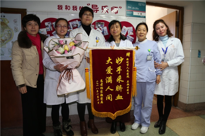 ??? “男童航航(化名)的家人很激動(dòng),一定要叫我代表他們來(lái)道聲感謝!”1月17日中午,浙江省臍血庫(kù)工作人員余亞圣一行人來(lái)到我院,向當(dāng)年采集這份臍帶血的醫(yī)生吳敏云贈(zèng)送了一面錦旗,感謝她采集了高質(zhì)量的臍帶血,并對(duì)捐獻(xiàn)臍帶血的產(chǎn)婦周琦表示感謝。
