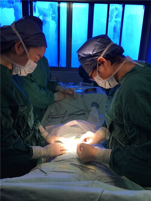 ??? 產(chǎn)科副主任紀(jì)毅梅主刀對徐女士實(shí)施了剖腹產(chǎn)術(shù),并取出了一名體重僅1.7斤的男嬰。醫(yī)生、護(hù)士們小心翼翼地捧著這個(gè)弱小的生命,放在預(yù)熱的輻射搶救臺上。